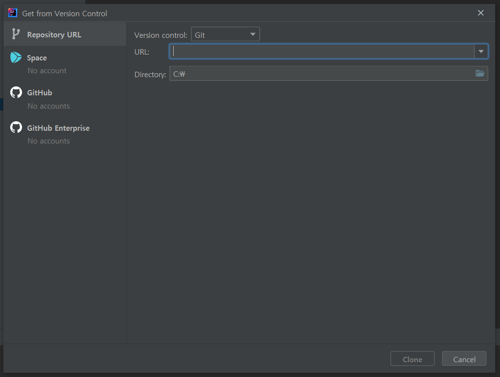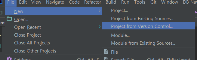먼저 file -> new -> project from version control을 클릭
