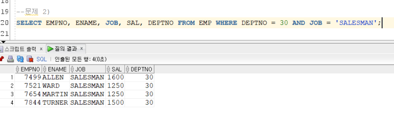SELECT EMPNO, ENAME, JOB, SAL, DEPTNO FROM EMP WHERE DEPTNO = 30 AND JOB = 'SALESMAN';