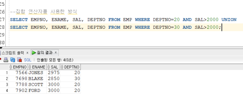 SELECT EMPNO, ENAME, SAL, DEPTNO FROM EMP WHERE DEPTNO=20 AND SAL>2000 UNION