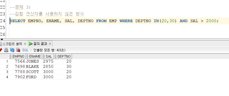 EMP 테이블을 사용하여 20번, 30번 부서에 근무하고 있는 사원 중 급여(SAL)가 2000초과인 사원을 다음 두 가지 방식의 SELECT문을 사용하여 사원번호, 이름, 급여, 부서 번호를 출력하는 SQL문을 작성해 보세요.