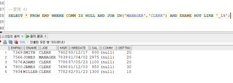 SELECT * FROM EMP WHERE COMM IS NULL AND JOB IN('MANAGER','CLERK') AND ENAME NOT LIKE '_L%';