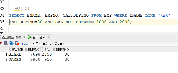 AND DEPTNO=30 AND SAL NOT BETWEEN 1000 AND 2000;