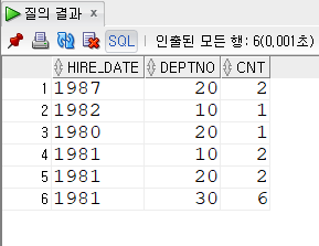 SELECT DEPTNO, TO_CHAR(HIREDATE,'YYYY') AS HIRE_DATE, COUNT(*) AS CNT,