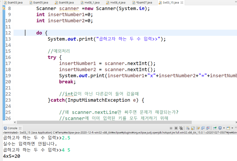 다음과 같이 실수가 입력되면 정수를 다시 입력하도록 하여 예외없이 정상적으로 처리되도록 예외 처리 코드를 삽입하여 Multuply 클래스를 수정하라.