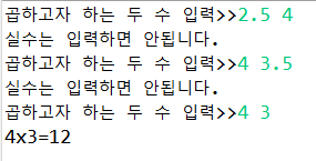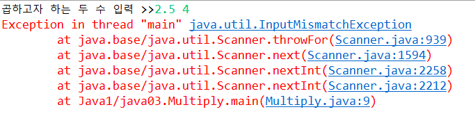 하지만 다음과 같이 실수를 입력하였을 때 예외가 발생한다.