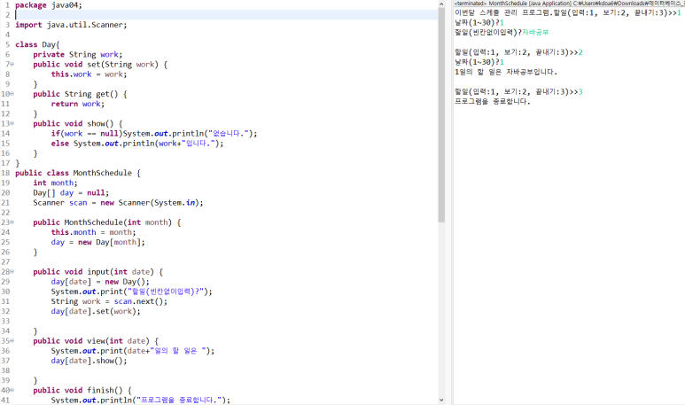 MonthSchedule 클래스에는 Day 객체 배열과 적절한 필드, 메소드를 작성하고 실행 예시처럼 입력, 보기, 끝내기 등의 3개의 기능을 작성하라.