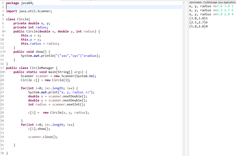 다음 실행 결과와 같이 3개의 Circle 객체 배열을 만들고 x,y,radius 값을 읽어 3개의 Circle 객체를 만들고 show()를 이용하여 이들을 모두 출력한다.